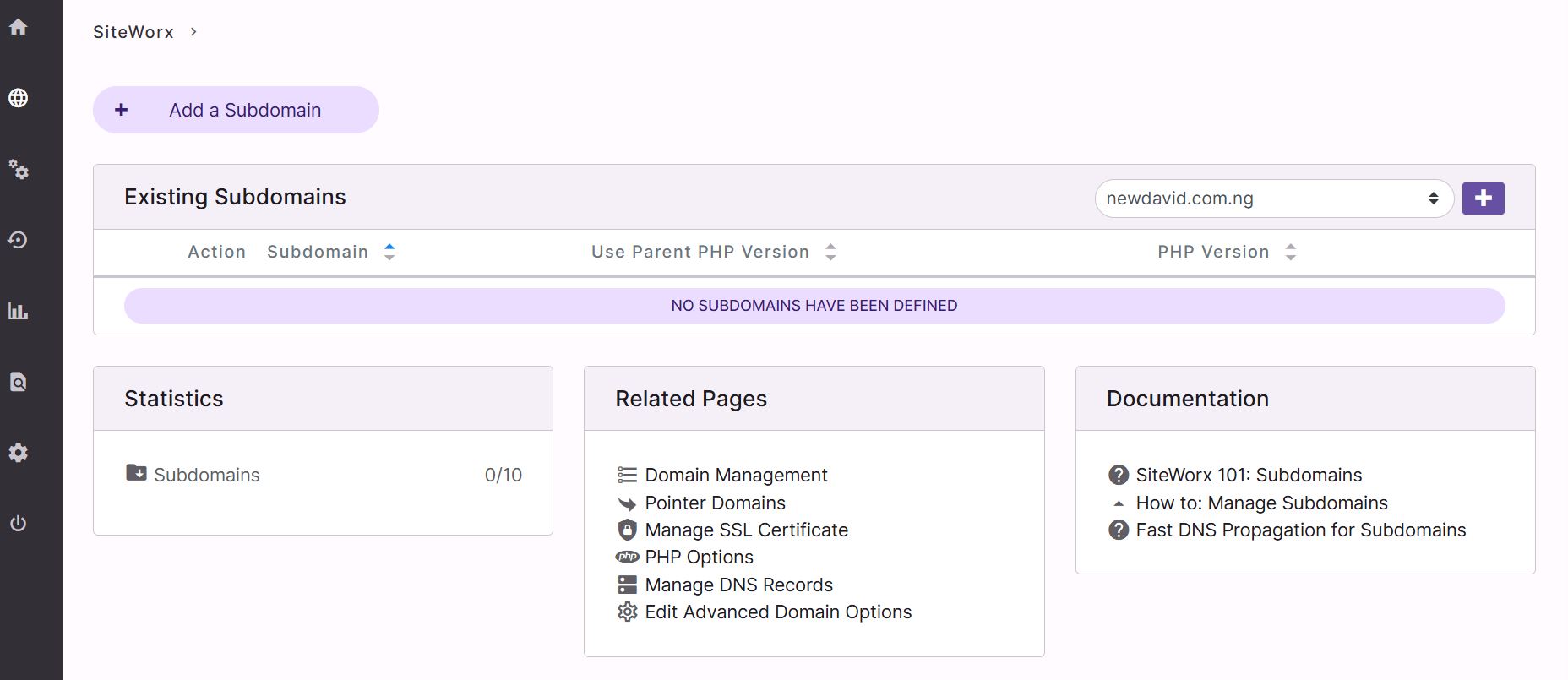 From the SiteWorx dashboard, navigate to Subdomains under the domain area.